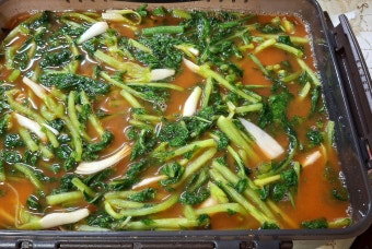 또한, 절이기 시작한 지 20분 정도 지났을 때, 반드시 아래위의 열무를 한 번 뒤집어주어야 합니다. 아래쪽의 열무는 먼저 절여지고, 위쪽은 덜 절여지기 때문에 중간에 위치를 바꿔주어야 균일하게 절일 수 있습니다. 열무 줄기를 살짝 구부려 보았을 때, '툭' 부러지지 않고 부드럽게 휘어지면 아주 잘 절여진 것입니다.