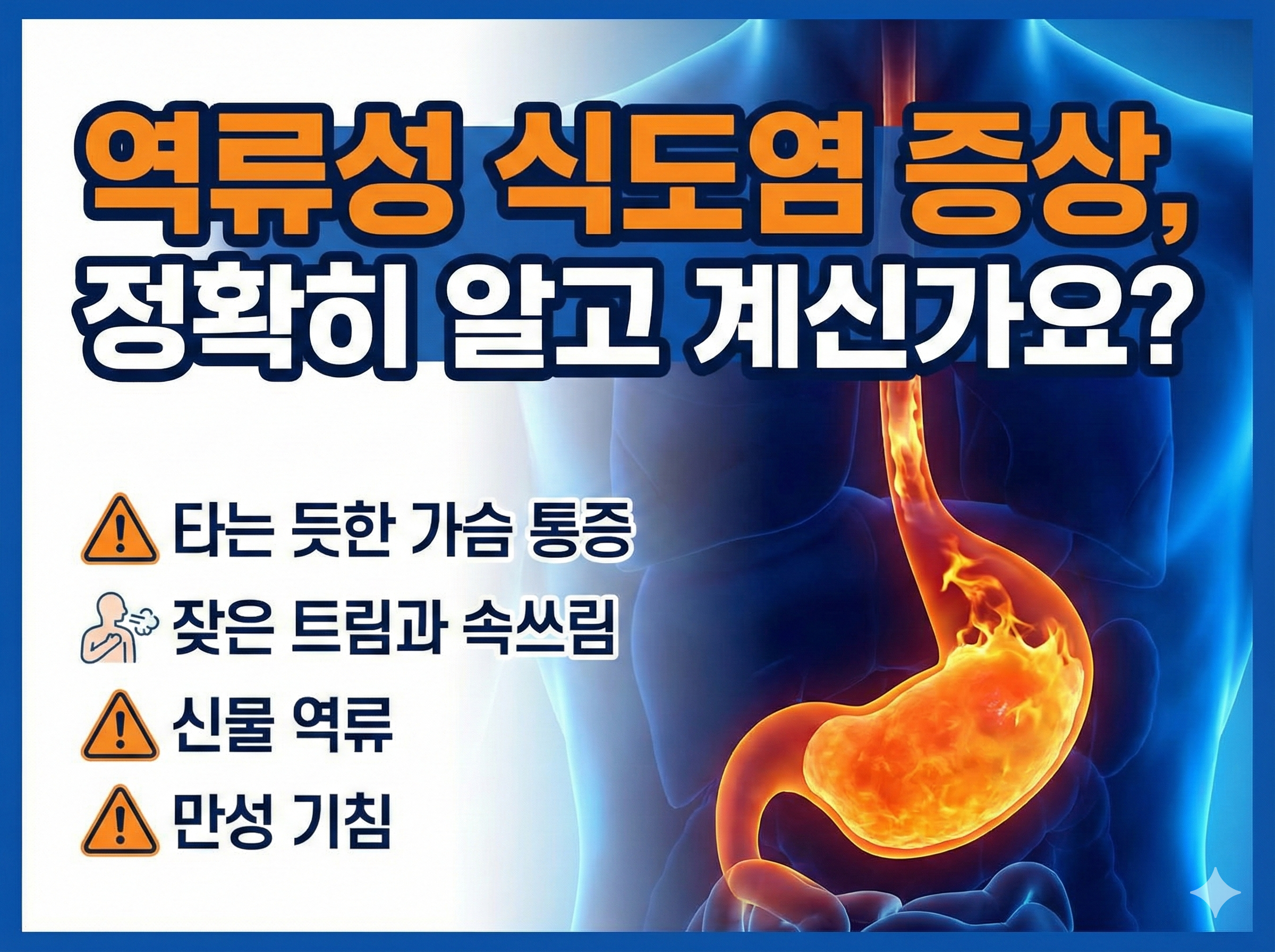 역류성 식도염은 위 내용물이나 위산이 식도로 역류하여 발생하는 염증성 질환으로 위식도 역류질환(GERD)의 범주에 포함됩니다. 많은 환자가 호소하는 가장 대표적인 증상은 가슴 쓰림과 신물이 올라오는 느낌입니다. 하지만 단순히 쓰린 느낌에 그치지 않고 가슴 안쪽이 타들어 가는 듯한 작열감이나 뻐근한 통증이 등이나 목으로 뻗어 나가는 방사통 형태로 나타나기도 합니다. 이러한 증상은 식도 점막이 강한 산성인 위산에 반복적으로 노출되면서 신경이 예민해지고 염증 반응이 일어나기 때문입니다.