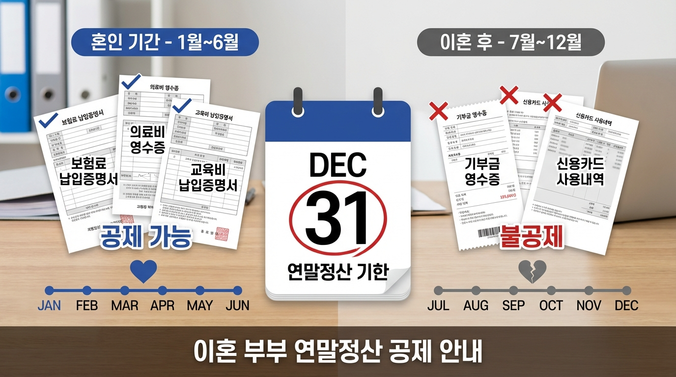 과세기간 종료일인 12월 31일 이전에 이혼한 경우에는 종전의 배우자에 대해 기본공제를 받을 수 없습니다. 하지만 이혼 전에 지출한 금액 중 일부는 공제받을 수 있는 항목이 있습니다.
