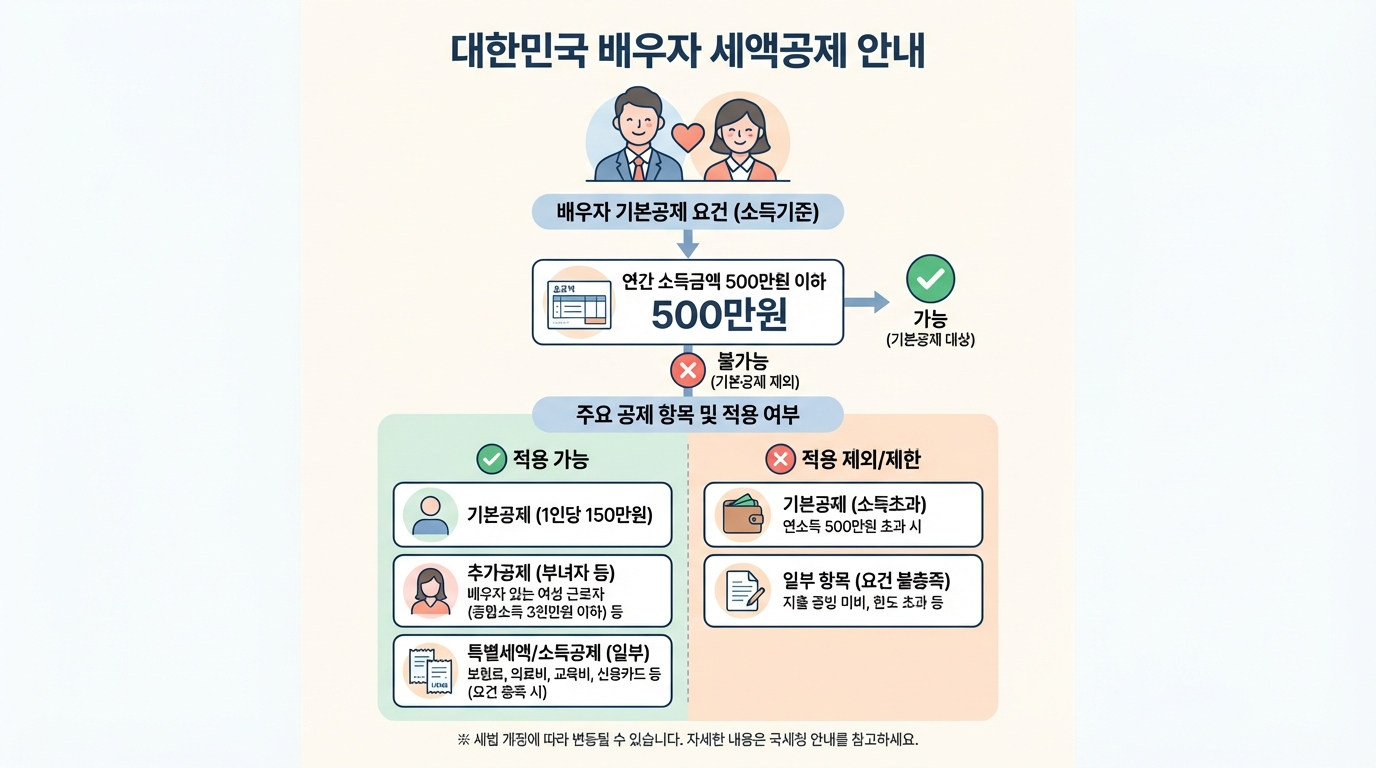배우자 기본공제는 배우자의 연간 소득금액이 100만원 이하일 때 받을 수 있습니다. 근로소득만 있는 배우자의 경우 총급여 500만원 이하가 기준이 됩니다. 이 조건을 충족하면 배우자 1명에 대해 연 150만원을 소득에서 공제받을 수 있습니다.