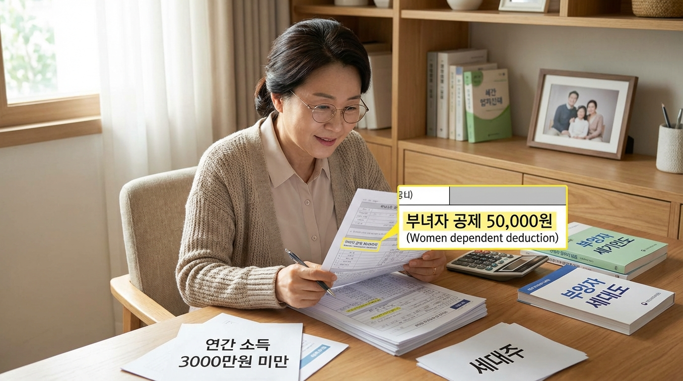 부녀자공제는 특별한 추가공제입니다. 종합소득금액 3천만원 이하인 여성 중 배우자가 없으면서 기본공제 대상 부양가족이 있는 세대주이거나 배우자가 있는 여성은 연 50만원 추가공제를 받을 수 있습니다. 배우자가 있는 여성은 세대주 여부와 관계없이 부녀자공제를 받을 수 있습니다.
