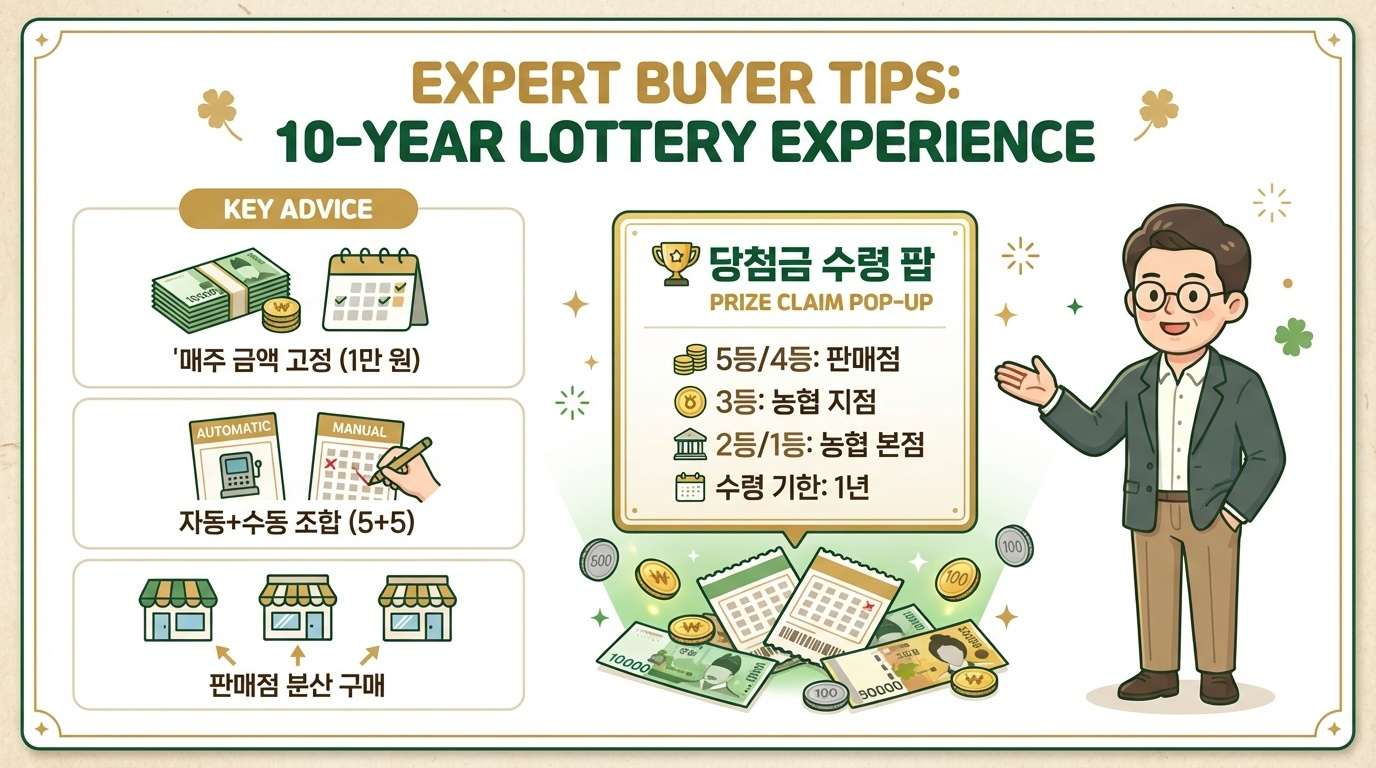 5등(5천 원)과 4등(5만 원)은 모든 로또 판매점에서 바로 수령 가능해요. 3등(약 150만 원)은 농협 지점에서, 2등과 1등은 농협 본점에서만 수령할 수 있어요. 그리고 당첨금 수령 기한은 지급 개시일로부터 1년이니까, 복권 보관 잘 하시고 꼭 기한 내에 찾으세요!