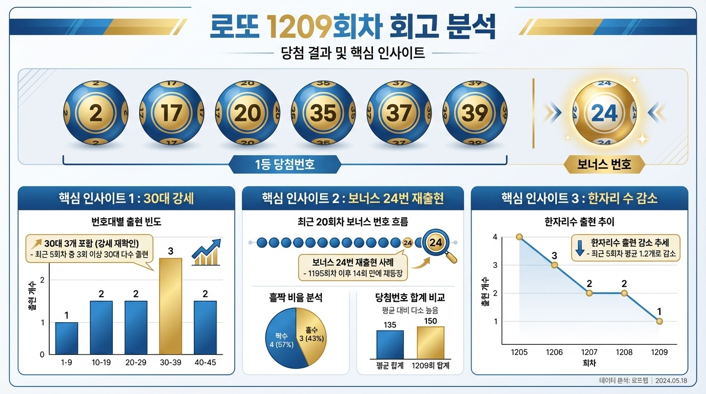 1209회 당첨번호는 2, 17, 20, 35, 37, 39(보너스 24)였어요. 이 결과를 분석해보면 몇 가지 흥미로운 패턴이 보여요.