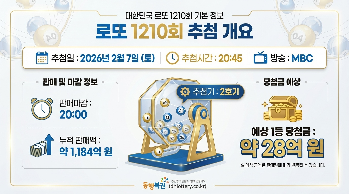 1210회 로또는 2026년 2월 7일 토요일 저녁 8시 45분에 MBC를 통해 생방송으로 추첨됩니다. 이번 회차는 2026년 2월 첫 번째 추첨으로, 새해 두 번째 달의 시작을 알리는 의미 있는 회차예요.