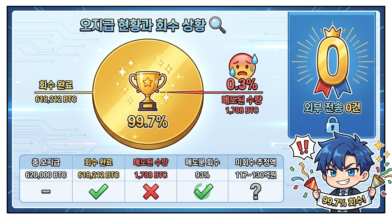빗썸이 공식 발표한 내용에 따르면 총 오지급 수량은 62만 BTC입니다. 이 중 61만 8,212 BTC가 회수 완료되어 전체의 99.7%를 회수한 상태입니다. 나머지 1,788 BTC는 이미 매도가 이루어진 물량입니다. 🔄
