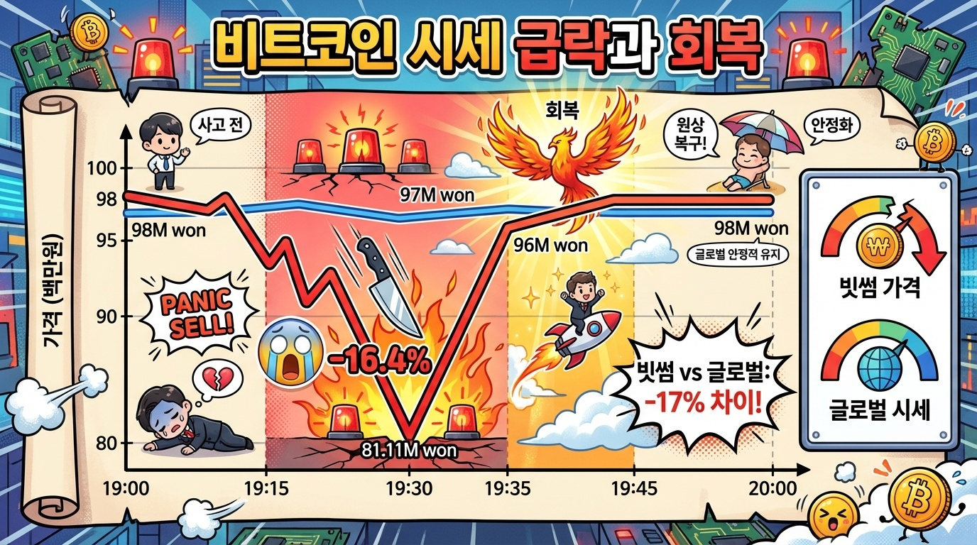 | 급락 시점 (19:30) | 8,111만 원 | 약 9,700만 원 | -16.4% |
