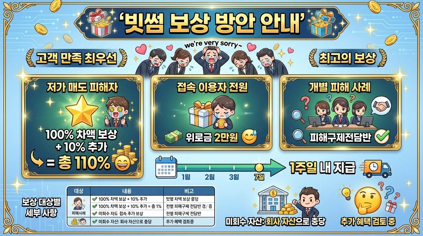 빗썸은 사고 시간대(오후 7시 30분~45분)에 저가 매도한 이용자에게 매도 차액 전액과 10% 추가 보상(총 110%)을 지급하겠다고 발표했습니다.