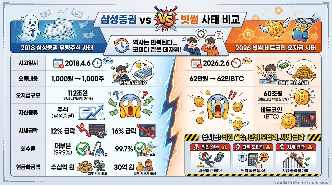 이번 빗썸 사태는 2018년 4월 발생한 삼성증권 유령주식 사건과 놀라울 정도로 유사합니다. 당시 삼성증권은 우리사주 배당금을 주당 1,000원씩 지급하려다 직원 실수로 1,000주씩 지급하는 사고를 냈습니다. 🔍