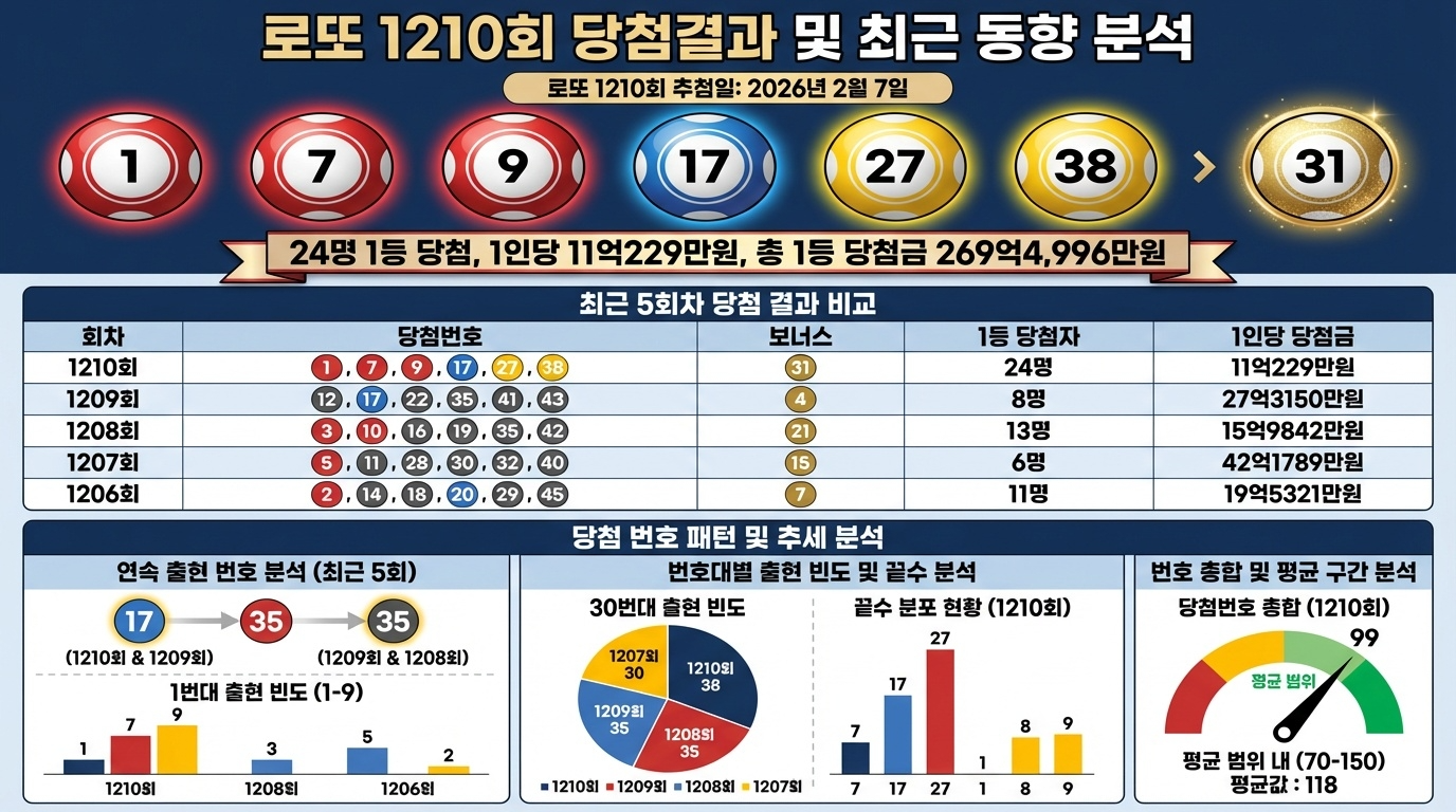 2026년 2월 7일 추첨된 로또 1210회 당첨번호는 '1, 7, 9, 17, 27, 38’이었습니다. 보너스 번호는 31번이 나왔습니다. 이번 회차에서는 1등 당첨자가 24명이나 나와 무더기 당첨이 화제가 되었습니다. 1인당 당첨금은 약 11억229만원으로 집계되었습니다.