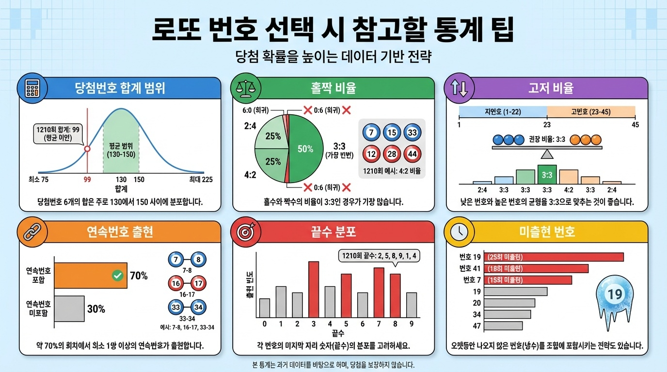 홀짝 비율을 보면 홀수 3개와 짝수 3개가 포함된 조합이 가장 빈번하게 당첨됩니다. 올짝(6:0)이나 올홀(0:6) 조합은 역대 당첨 사례가 거의 없습니다. 1210회는 홀수 4개(1, 7, 9, 17, 27)와 짝수 2개(38)로 홀수가 약간 많았습니다.