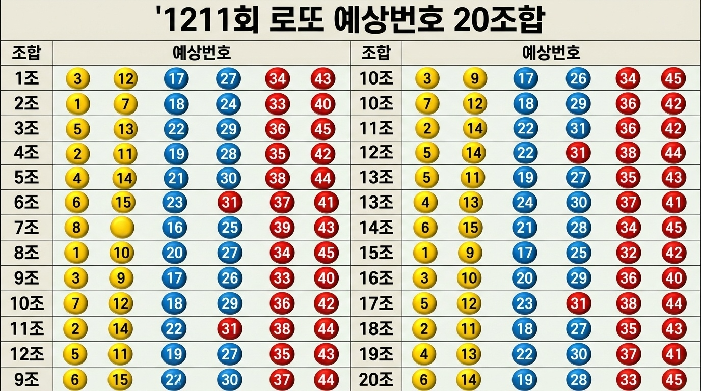 통계 분석과 최근 패턴을 종합하여 1211회 예상번호 20조합을 준비했습니다. 최다 출현 번호, 최근 연속 미출현 번호, 번호대별 균형 등을 고려하여 구성했습니다.