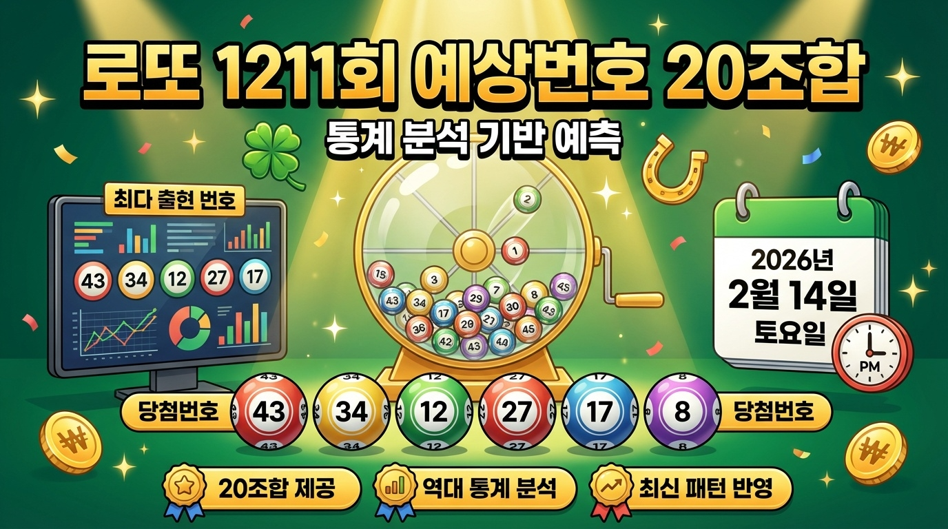 로또 1211회 추첨은 2026년 2월 14일 토요일 오후 8시 35분에 MBC에서 생방송으로 진행됩니다. 판매 마감은 같은 날 오후 8시입니다.